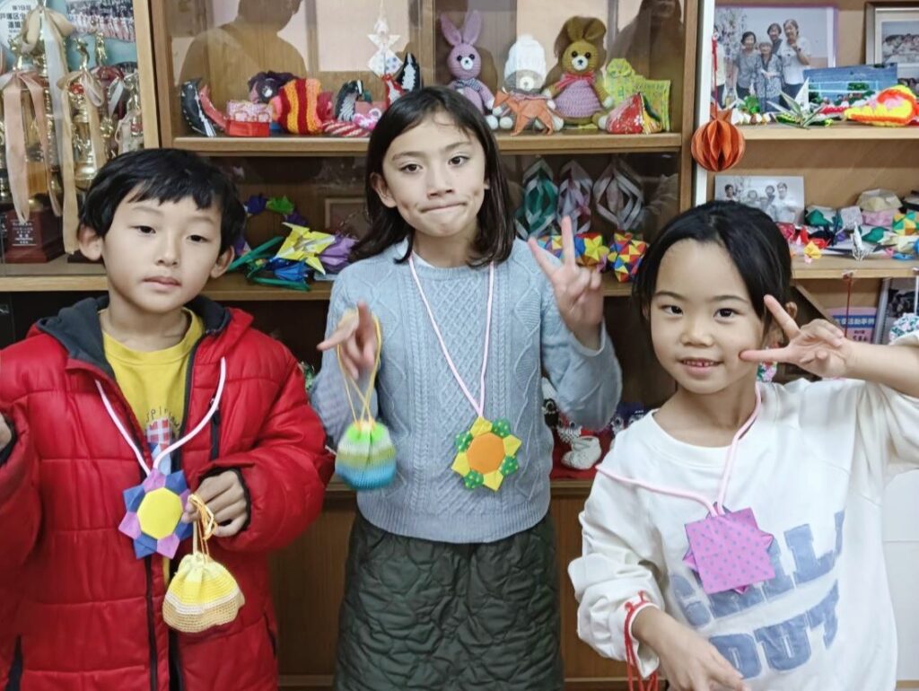 11月21日(金)、小学1・2年生が、小菅ケ谷連合町内会自治会のシニアクラブに訪問しました。高齢者向けの献品と手作りのキーホルダーをプレゼントし、クラブのお祖母様たちからは、折り紙で作ったネックレスと手作り編みのプチ袋にいっぱいのお菓子をお土産にいただきました。子ども達はお祖母様たちにしっかりと挨拶をし、いろいろな手編みの作品を見せてもらって、かわいい〜と笑顔いっぱいにお祖母様たちとのひとときを楽しみました。